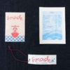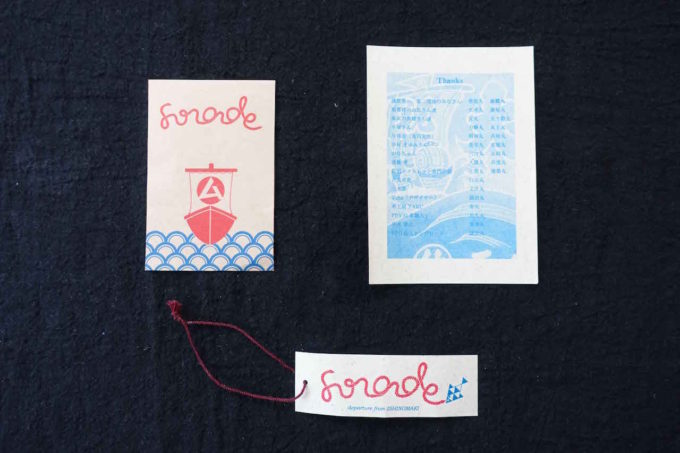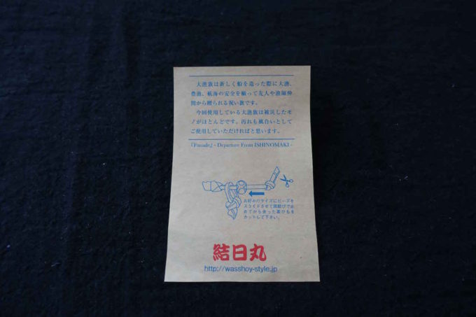 大漁旗を編んで作ったミサンガのパッケージの制作、商品につけるタグも作りました。タグは触ってみると凹凸ができるように加工しました。